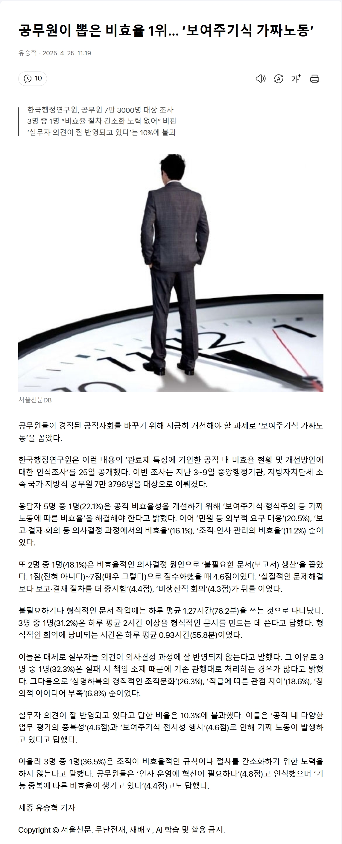 공무원이 뽑은 비효율 1위… ‘보여주기식 가짜노동’